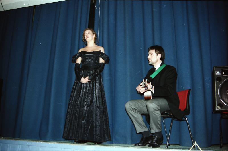 Bilde fra Skoger Ungdomslags markering av at laget har eksistert i 100 år med jubileumsfest på Skogvang 14. mars 1992. Elisabeth Knudsen og Stein-Erik Bjørnerud i revy-innslag.