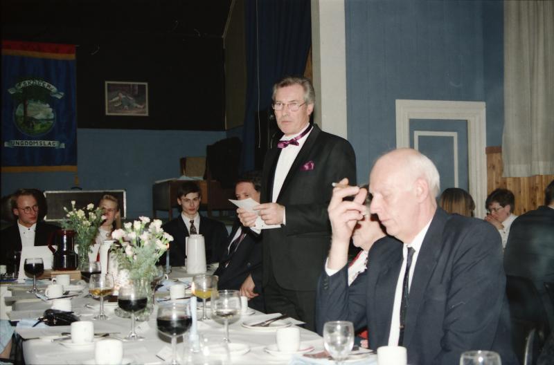 Bilde fra Skoger Ungdomslags markering av at laget har eksistert i 100 år med jubileumsfest på Skogvang 14. mars 1992. Sokneprest Bernt Vogt Ramslie overbringer hilsen til laget fra Skoger menighet.