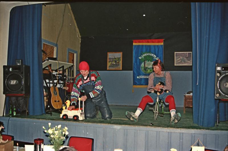 Bilde fra Skoger Ungdomslags markering av at laget har eksistert i 100 år med jubileumsfest på Skogvang 14. mars 1992. Revyinnslag ved Per-Terje Guriby og Elisabeth Juel Ramnæs.