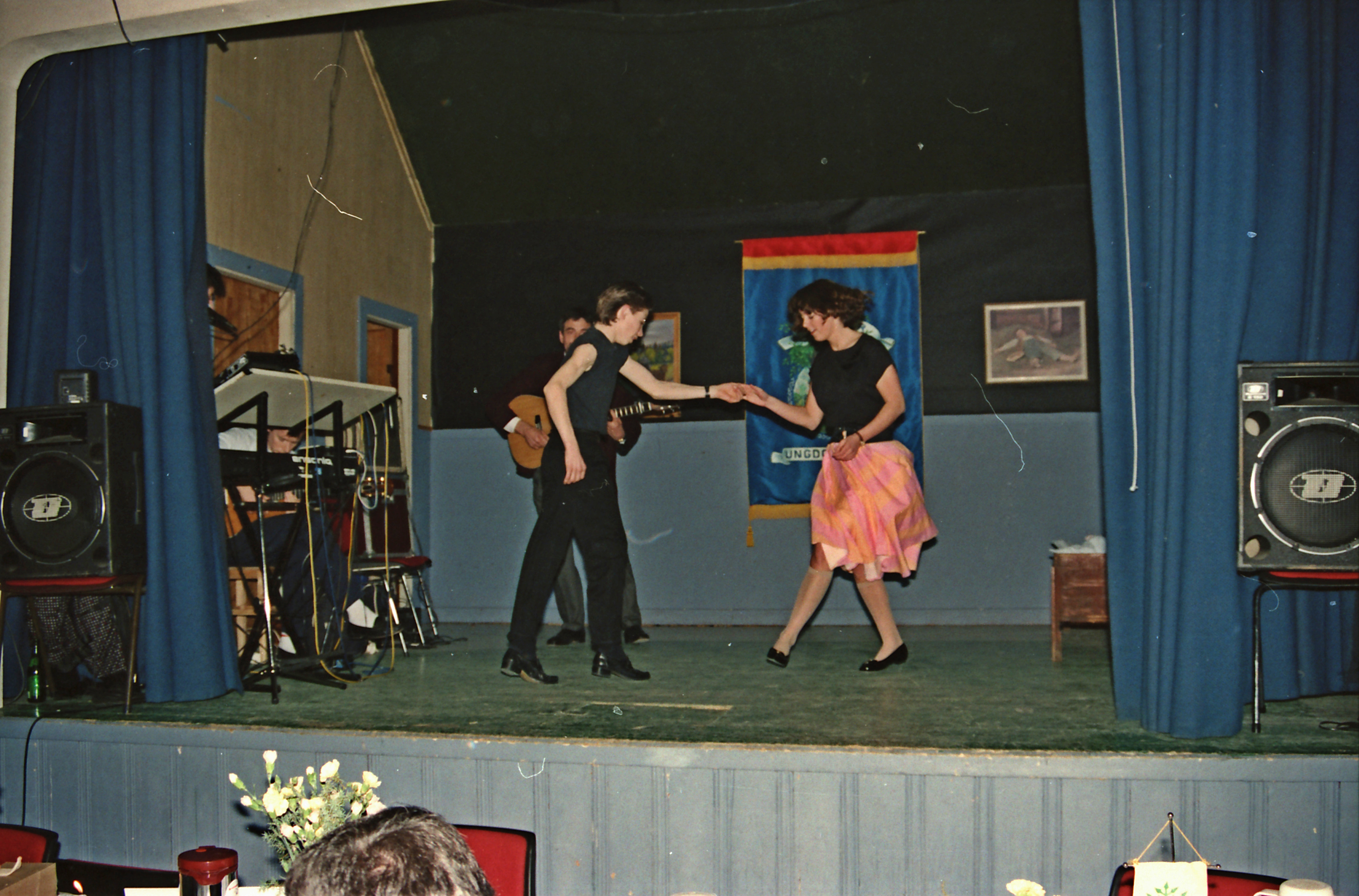 Bilde fra Skoger Ungdomslags markering av at laget har eksistert i 100 år med jubileumsfest på Skogvang 14. mars 1992. Danseoppvisning av Vegard Bråthen og Birgit Bonden.