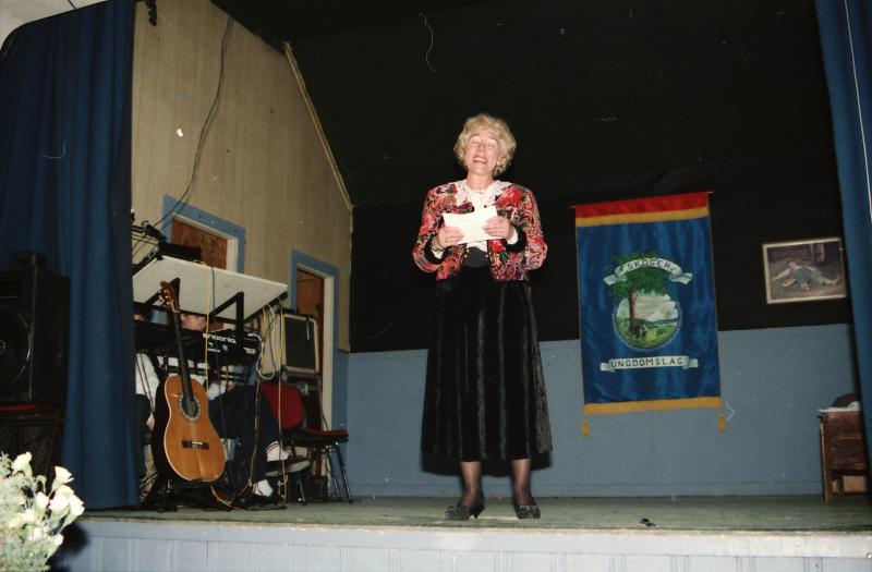 Bilde fra Skoger Ungdomslags markering av at laget har eksistert i 100 år med jubileumsfest på Skogvang 14. mars 1992. Prolog ved Inger Hyllseth.