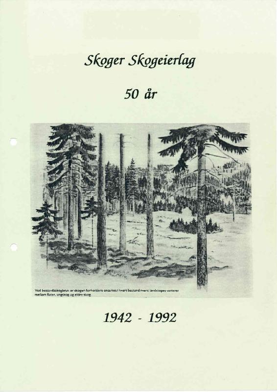 Jubileumsberetning etter 50 års drift av Skoger Skogeierlag. Hefte i plastomslag delt ut til alle medlemmer i 1992. NB! Sidene i heftet kan ikke vises direkte. Orginalfila må lastes ned og så åpnes på egen maskin. I Windows 10 virker det slik: Klikk «Last ned», det kommer opp et avlangt vindu nederst på skjermen, vent til nedlastingen er ferdig og klikk «Åpne». I andre operativsystem vil dette i prinsippet være omtrent likt, men se noe annerleds ut.