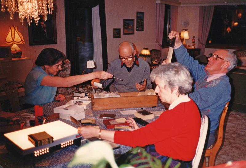 Fotokomiteen i arbeid, her 16. mars 1988 hjemme hos Anne-Lise Møller Nilsen. Fra venstre: Åse Tandberg, Toll Tollum, Anne-Lise Møller Nilsen og Helge Furuvold.