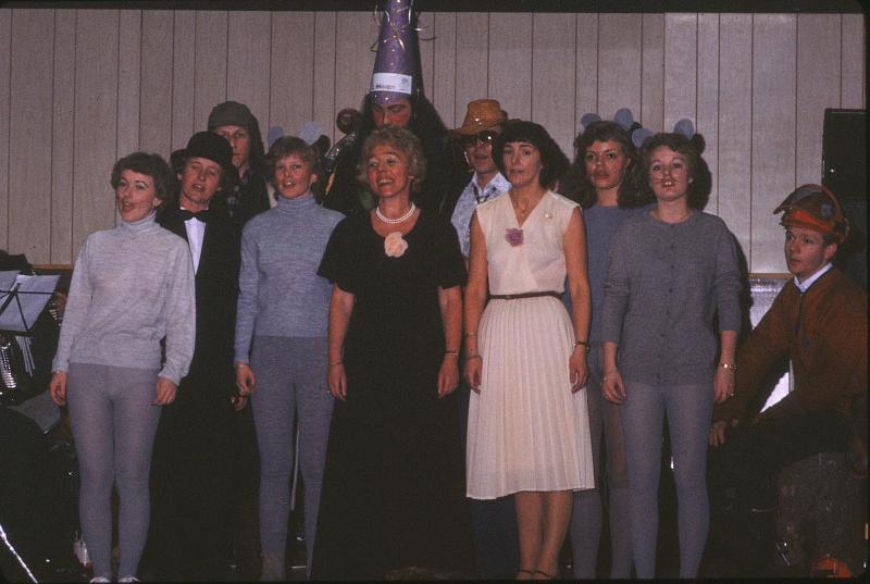 Fra jubileumsfesten med revy Fra venstre på bildet: Turid Skjeldrum, Ella Hindhamar, Knut Ole Røed, Marit Holmen, Terje Hindhamar (bak), Inger Hyllseth, Karl Johan Knudsen, Inger Juel Hoven, Halldis Christiansen, Randi Engen og Jan Elgvang.