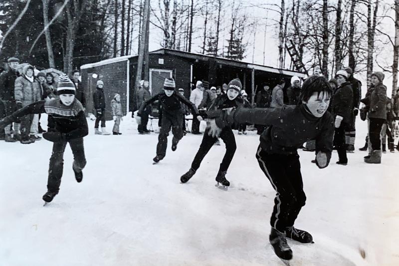 Bildet er fra skøytedagen 14. februar 1982. Frank Engelkor har tatt ledelsen over klubbkameratene Tommy Rune Hansen, Morten Hagen og Bjørn Ekebergleder her på Speedbanen 14. februar 1981