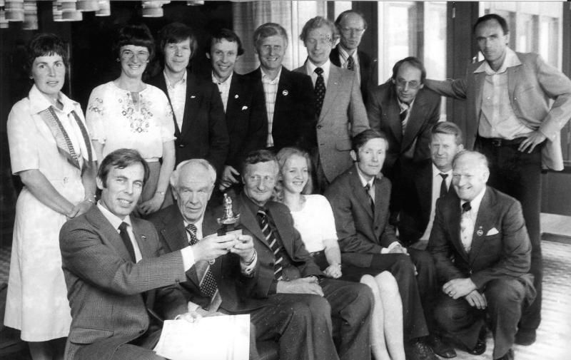 Drammen Sparebank fikk utdelt en ærespris på 10000 kroner etter NM på ski på Konnerud i 1978. Her er hovedstyrets medlemmer m.fl samlet i Drammen Sparebank under overekkelsen av prisen. Foran fra venstre:Gunnar Løvås, Rolf Pettersvold (1912-1981), Oskar Mortensen (1922-1996), Åshild Kollerud, Arild Bjølgerud, Per Hansen, og Arne Kristoffersen. Bak fra venstre: Randi Sommerstad, Gerd Eriksen, Tore Axelsen, Erik Dalheim (ordfører), Hans Olsen, Geirr Kihle, Ragnar Anker Nilsen (Drammen Sparebank), Bjørn Jonassen og Arve Larsen.