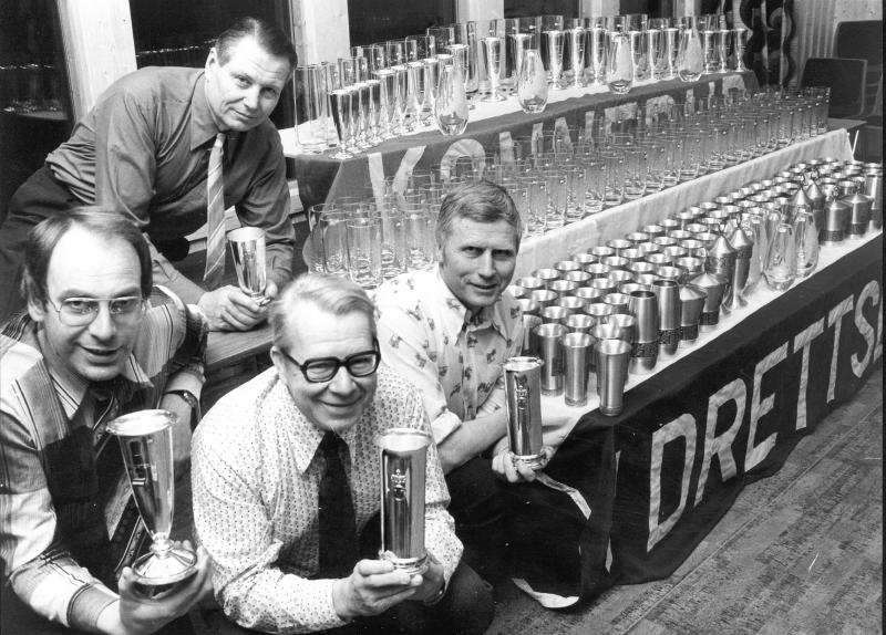 NM premiebord 1978 før utdelingen på klubbhuset. Fra venstre i front Bjørn Jonassen, Erling Lindseth, Hans Th. Olsen, og bak Karl Kubar