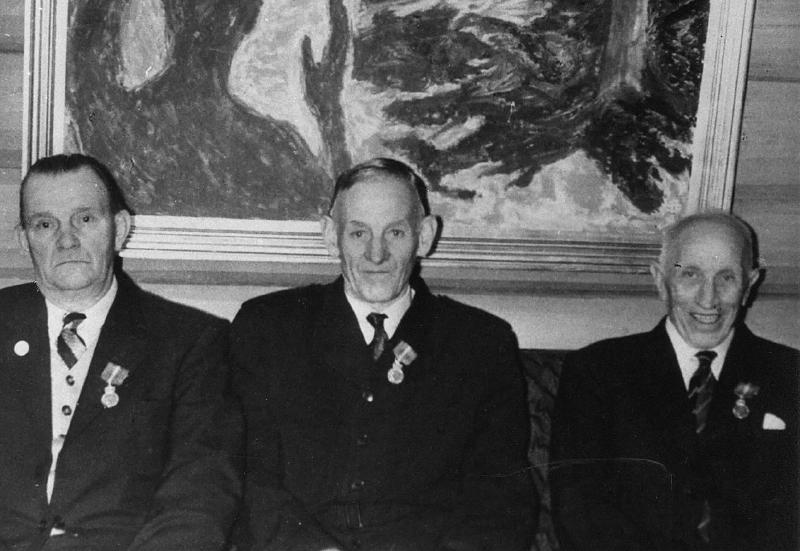 Tekst: Torill Juel Fra v.: Karl Bråthen (1893-1971), Thomas Løkka (1889-1971) og Ole Furuvold.(1886-1966). Tildelt Norges Vels medalje for lang og tro tjeneste etter 50 års arbeid i skogen for Selvik Bruk A/S. Karl Bråthen f. 26/11-1893 d. 24/7-1971 - Bodde i Bråtan Thomas Løkka f. 13/11-1889 d. 10/1- 1971 - Bodde i Løkka Ole Furuvold f. 28/7-1886 d. 20/11-1966 - Bygget hus i Garåsbakken Da sto AIIes Vel ferdig. Det er derfor å anta at en innvielse fant sted i 1918