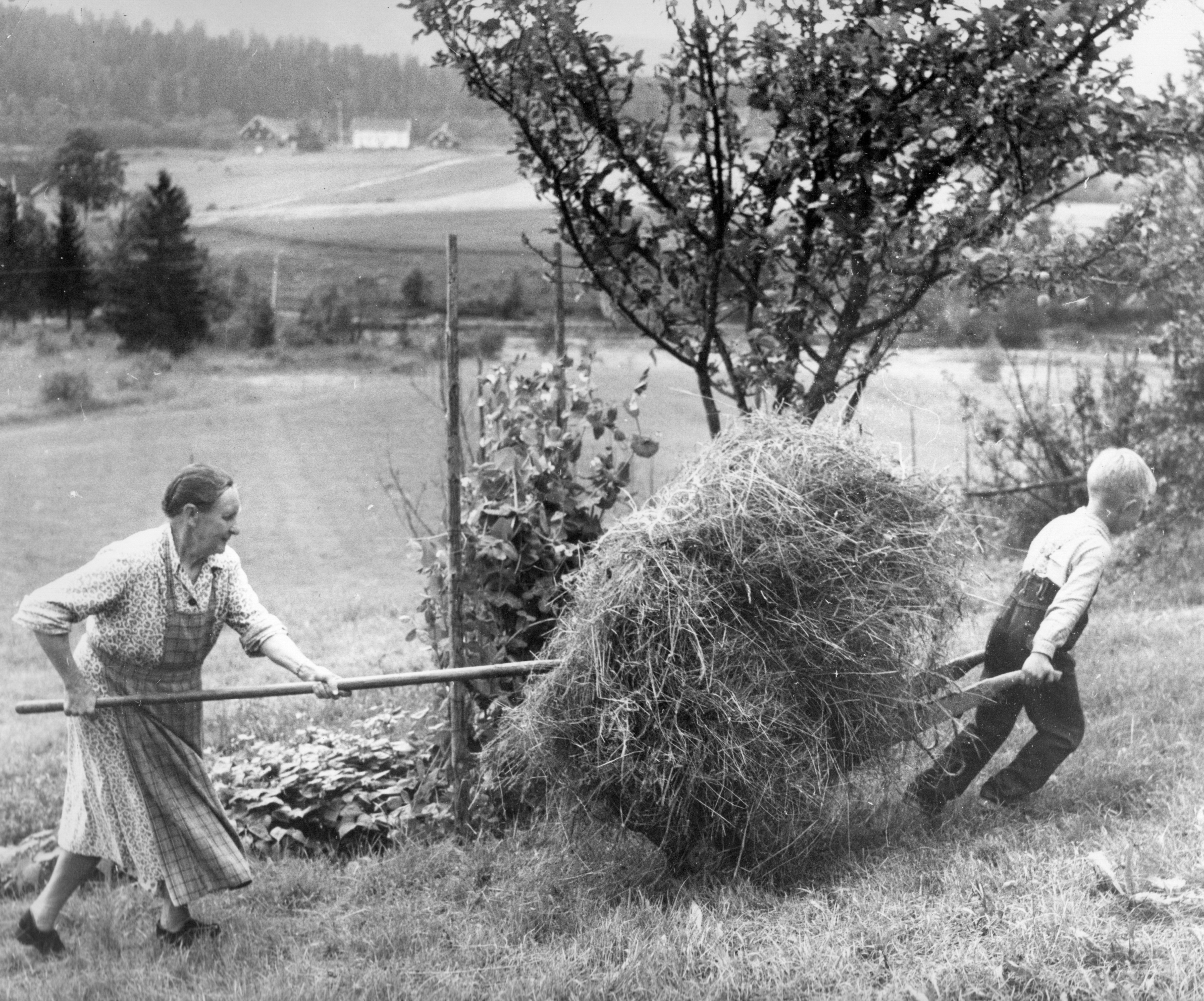 Dette bildet er tatt i Solbakken (et småbruk i Svingen) av Reidar Halden, den 6.August.1960. Det er Magna Solbakken og barnebarnet Arve Hansen som arbeider med høyet.
