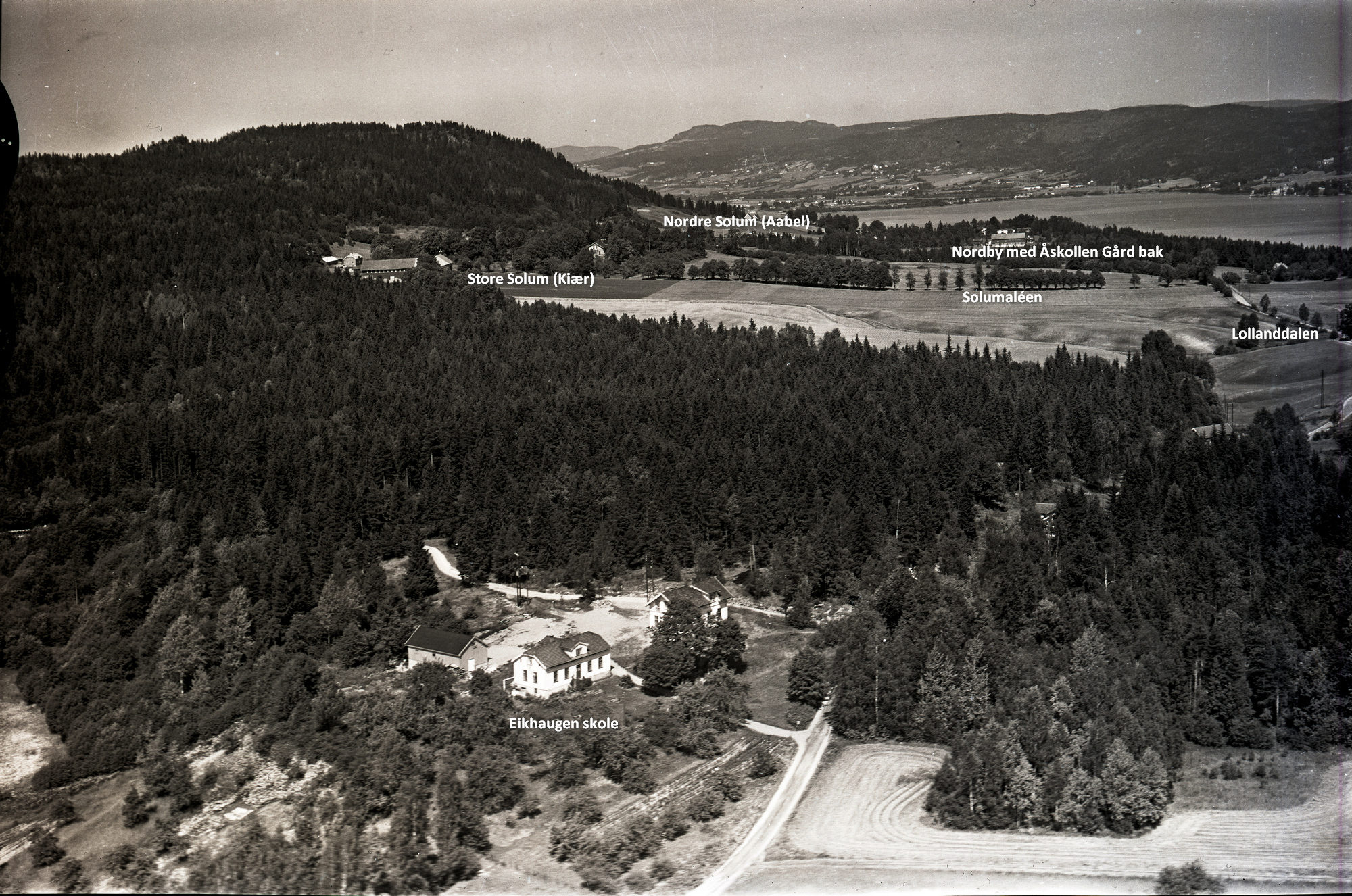 Bildet er lånt fra Drammen Byarkiv og er tatt 13. juli 1955 av Rolf Ingelsrud, Widerøe. I forgrunnen Eikhaugen skole. I midten Store Solum (Kiær). Over, Nordre Solum (Aabel). Oppe mot høyre, Nordby (Christiania Glassmafgasin) med Åskollen Gård bakenfor. Se bildet med stedsangivelser under alternative filer.