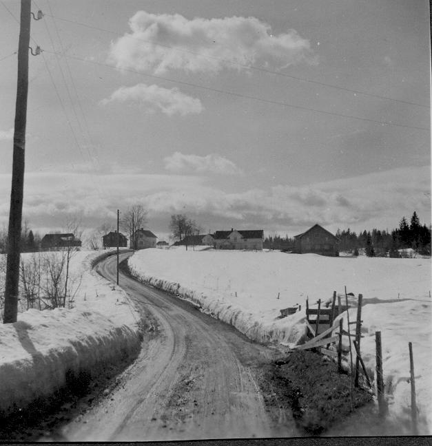 Gården i bakgrunn heter Damstokk. Oscar Ingvald Stubberud overtok gården i 1927 etter faren Anders (1886-1938) Oscar (1903-1981), ble gift med Gudrun Haugheim (1903-1947). De fikk sønnen Anders f. 1930. Han ble gift med Gunbjørg f. Prestegård. Oscar giftet seg på nytt med Elna f. Gomperud. Sammen fikk de sønnen Ove Eldar som sammen med kona Astrid eier gården. Legg merke til Stubberudveiens bredde og beskaffenhet i1955.