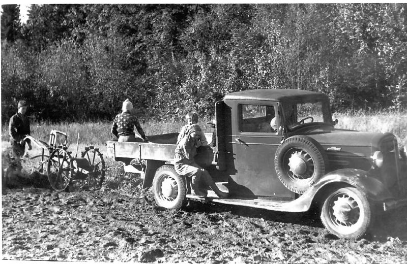 Oskar Stubberud tar opp poteter med en Cheverolet lastebil 1936-modell. Oskar kjører og sønnen Anders går bak potetopptakeren. Liv Rustand sitter fremst på lasteplanet. Liv er gift og har etternavnet Estensen.