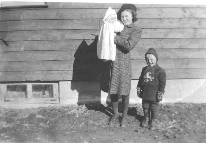 Gerd Nina Boman, gift med Torbjørn Boman og bodde ved Skoger stasjon, her med sønnene Arild født 1940 og Dag født 1943. Kåpa er sydd med vranga ut.