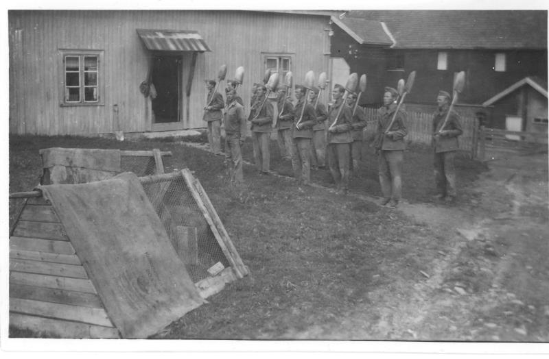 Bildet er tatt tidlig på 1940-tallet på gården Thorrud og viser arbeidstjenesten ute på oppdrag under krigen. Opplysningene om dette har Fotogruppa fått fra Solveig Arenth som skriver: "Jeg tror dette er et bilde av Arbeidstjenestegutter ute på oppdrag. AT - gutter fra 1941 og jenter fra 1943 - bodde på Ingvaldsåsen skole og Skogvang en periode. Mannskapene var uniformerte, men utstyrt med spader istedefor gevær. De ble sysselsatt med jord- og skogbruksarbeider, grøfting, vegarbeid og annet. Flertallet av befalet var medlemmer av NS. I og med at AT ble assosiert med NS rømte en del "vernepliktige" til skogs, derav uttrykket gutta på skauen. Hvorfor jeg så godt husker AT er at jeg hadde min skolestart (1942) med skolestue i Skoger Bedehus (lillesalen) fordi skolen på Ingvaldsåsen var opptatt av AT. Dertil at håndballdamene ved oppstart i 1945 fikk overta som drakter AT-jentenes gymnastikktøy. Fine lysegrå forsilke- drakter. Gjerpen i Skoger, 6.10.2014 Solveig Arenth" Fotogruppa takker Solveig Arenth for opplysningene og en interessant og opplysende tidsvitneskildring.
