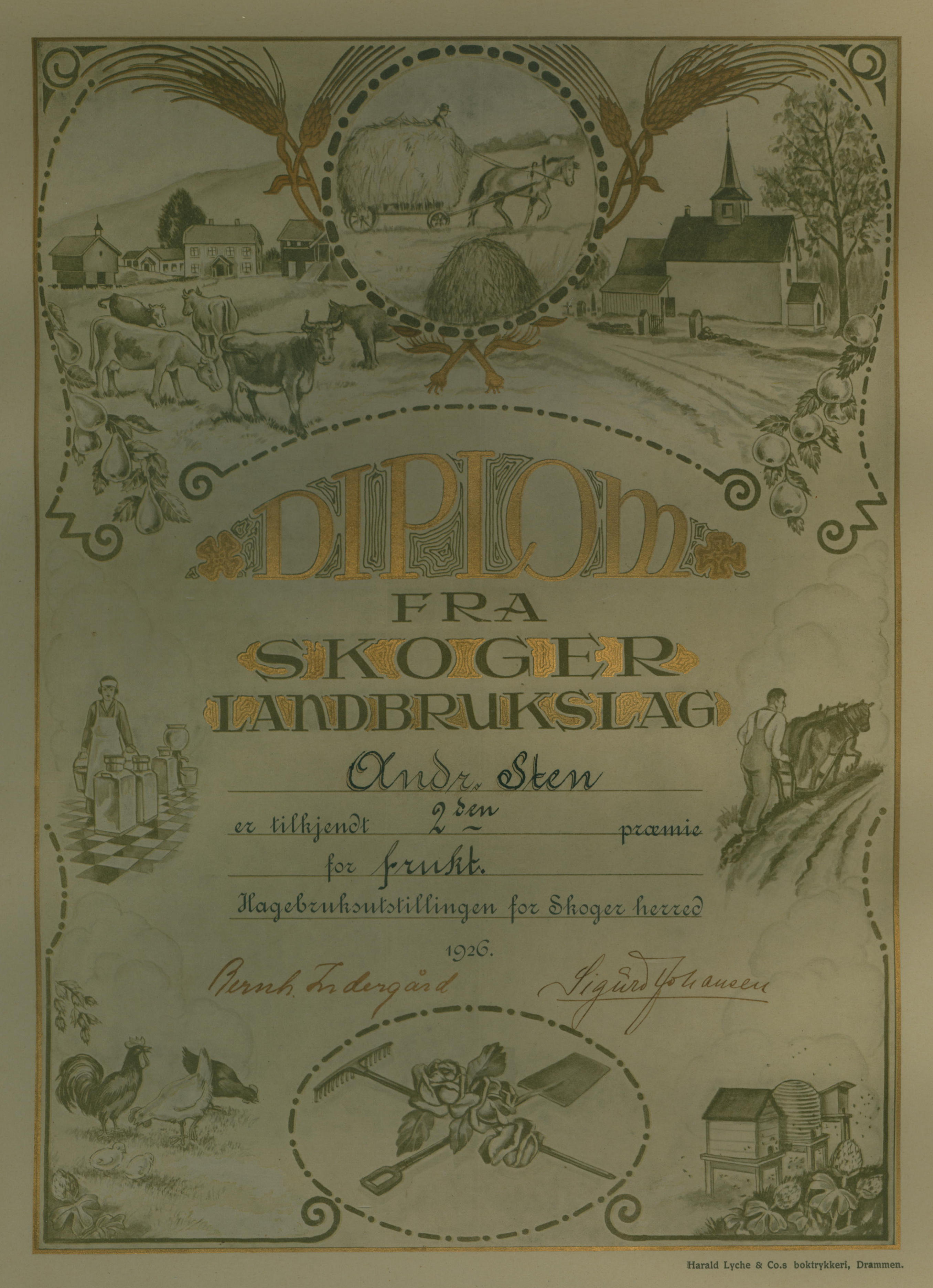 “Diplom fra Skoger Landbrukslag,” Skoger og Konnerud historielags bildesamling, besøkt 26. februar 2026, https://www.skhist.nettsidetesting.no/items/show/2941.