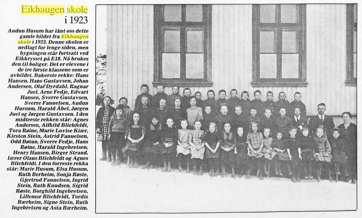 Eikhaugen skole 1923. Artikkel i DT&BB 18. februar 1991 med bilde lånt fra Audun Husum, Skoger.