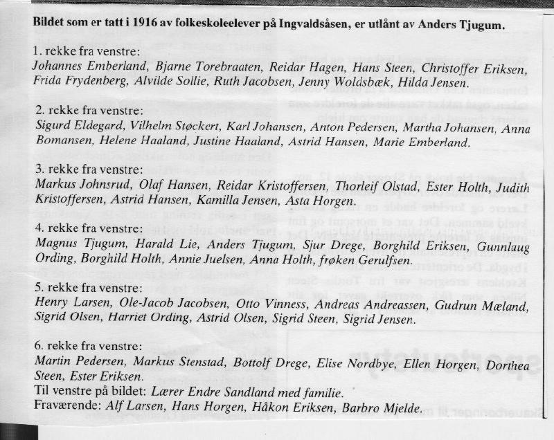 Navnene er: 1. rekke fra venstre: Johannes Emberland, Bjarne Torebraaten, Reidar Hagen, Hans Steen, Christoffer Eriksen, Frida Frydenberg, Alvilde Sollie, Ruth Jacobsen, Jenny Woldsbæk, Hilda Jensen. 2. rekke fra venstre: Sigurd Eldegard, Vilhelm Støckert, Karl Johansen, Anton Pedersen, Martha Johansen, Anna Bomansen, Helene Haaland, Justine Haaland, Astrid Hansen, Marie Emberland. 3. rekke fra venstre: Markus Johnsrud, Olaf Hansen, Reidar Kristoffersen, Thorleif Olstad, Ester Holth, Judith Kristoffersen, Astrid Hansen, Kamilla Jensen, Asta Horgen. 4. rekke fra venstre: Magnus Tjugum, Harald Lie, Anders Tjugum, Sjur Drege, Borghild Eriksen, Gunnlaug Ording, Borghild Holth, Annie Juelsen, Anna Holth, frøken Gerulfsen. 5. rekke fra venstre: Henry Larsen, Ole-Jacob Jacobsen, Otto Vinness, Andreas Andreassen, Gudrun Mæland, Sigrid Olsen, Harriet Ording, Astrid Olsen, Sigrid Steen, Sigrid Jensen. 6. rekke fra venstre: Martin Pedersen, Markus Stenstad, Bottolf Drege, Elise Nordbye, Ellen Horgen, Dorthea Steen, Ester Eriksen. Ytterst til venstre lærer Endre Sandland m/familie.