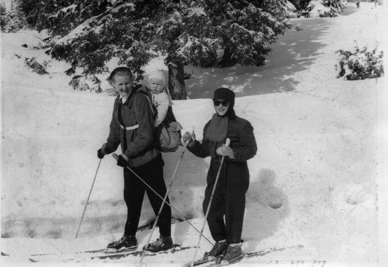 Fra v. Gerd Haugfos med Jens Kristian på ryggen og Lissen Haugfos på vei mot Nikkerud påsken 1955