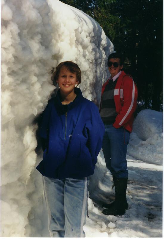 Den store snøvinteren 1988. Personene på bildet fra v. Beate Haakonsen (f. Blixrud) og hennes far Børre A. Blixrud på søndagstur.