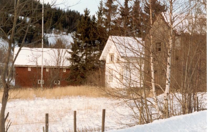Låven i forgrunnen og det hvite huset tilhører Helene Knudsen. Låven er i dag erstattet med en dobbel garasje. Hus og garasje tilhører Magnus Dahlby m/fam. Den røde låven i bakgrunnen tilhører Ove Thoresens fam. (Thoresen elektriske). Sønnen, Vidar, har nå overtatt (2008).