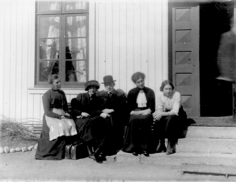 Fra v.: Hanna Hafslund, søster av Marthine Bjerknes. Ingeborg , Alf, Karen og Ester Bjerknes, på Stormoen