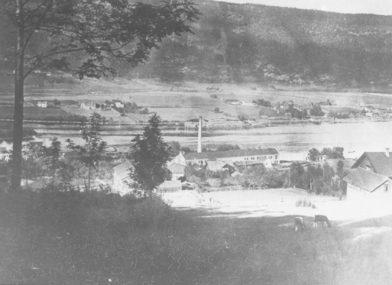 Pukerud Papirfabrikk. egentelig Jarelsberg Paper Mill. Totoet er tatt fra gårdsplassen på Pukerud gård ( Egge ) Pukerudlinaa i forgrunnen