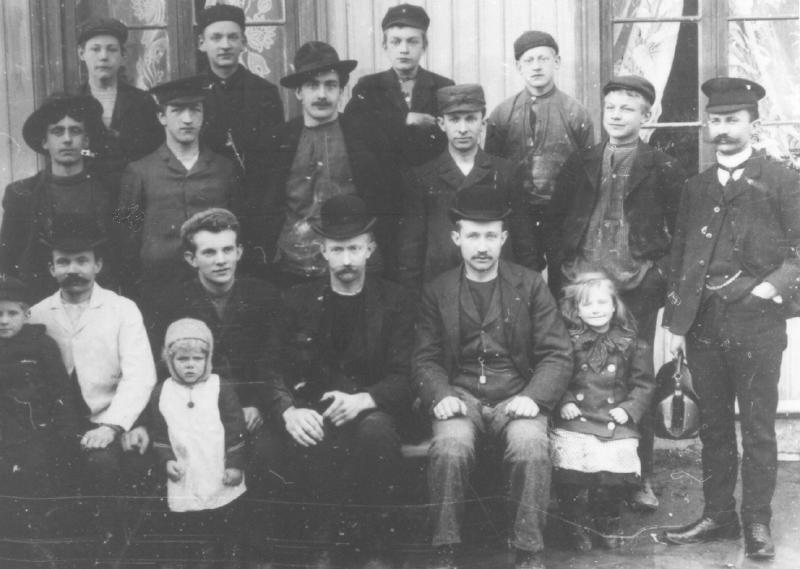 1 rekke fra v: Erlig Pedersen på sin fars fang - Hans far Hjalmar Pedersen - Hans bror Aleksander Pedersen - Karl Pedersen - Martinius Pedersen - Hans lille datter. 2 rekke fra v: Thorvald Torgersen - Karl Dignes - Olaf Petersen fra Rebbensbakken - Johan Pettersen. 3 rekke fra v: Aksel Ludviksen - Otto Torgersen - Karl Hermansen - Gunnar Sjøgren - Mannen med koffert er Johan Pedersen