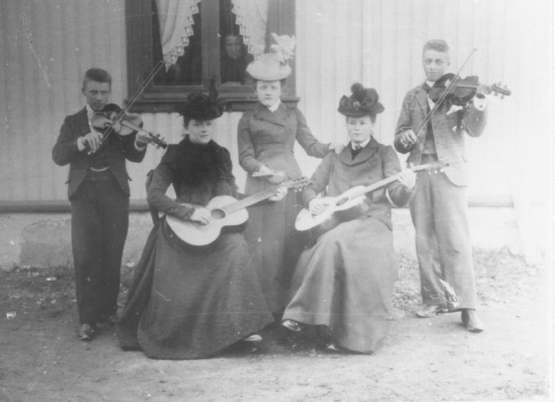 Ungdommer anno 1900. Fra v: Ludvig Bakke - Gunda Haugen - Linda Larsen - Ingeborg Gulbrandsen - Hakon Hagen - I vinduet Elen Louise Larsen
