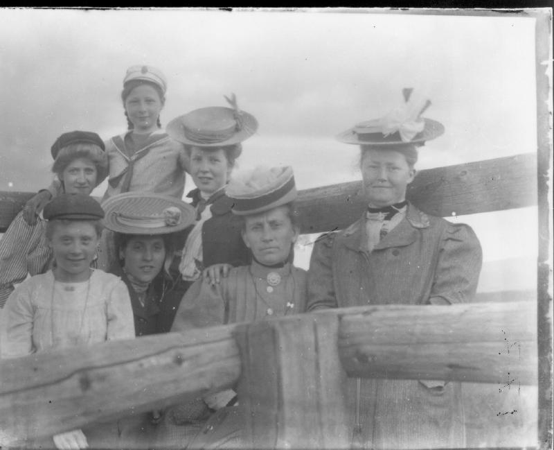 Fra øverste etage paa udsigts-taarnet paa Konnerud. Ingeborg Børjeson, Karen, fru Børjeson, Gina Andersen, Aja Høeg, Ingeborg Bjerknes og Agnes Clausen.