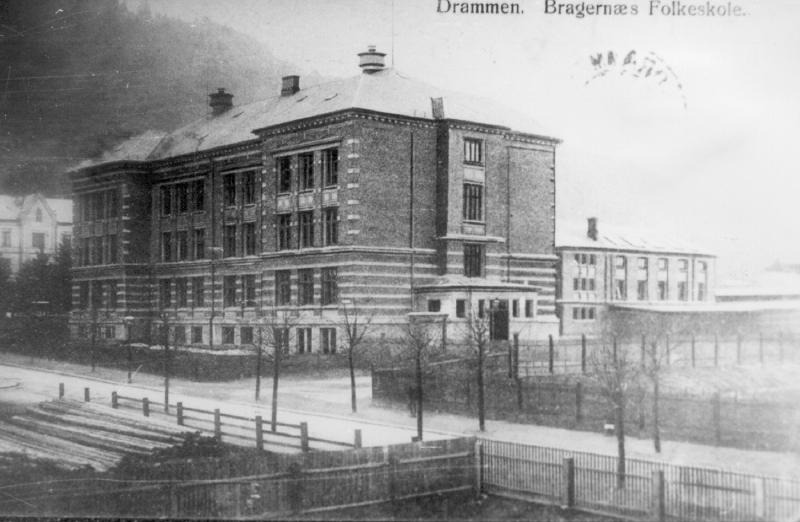 Bragernes Folkeskole ( revet til fordel for utvidelse av BBS. Sykehuset skimtes til venstre.