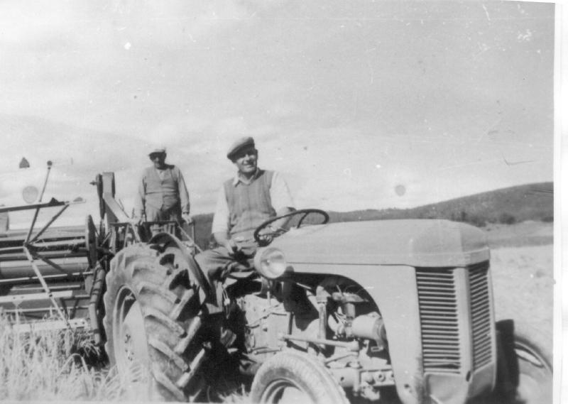 Kristoffer Myhre (bak) og Kolbjørn Hyllseth. Tresking m/ Aktiv Skurtresker og Ferguson traktor