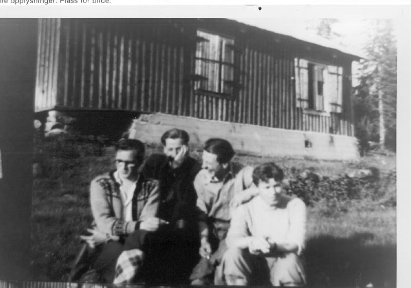 Pinsetur til gamlestova på Saggravdal. Fra v,: Arne Jordbræk , Hans Halden , Rolf Kaspersen, Bernt Jordbræk