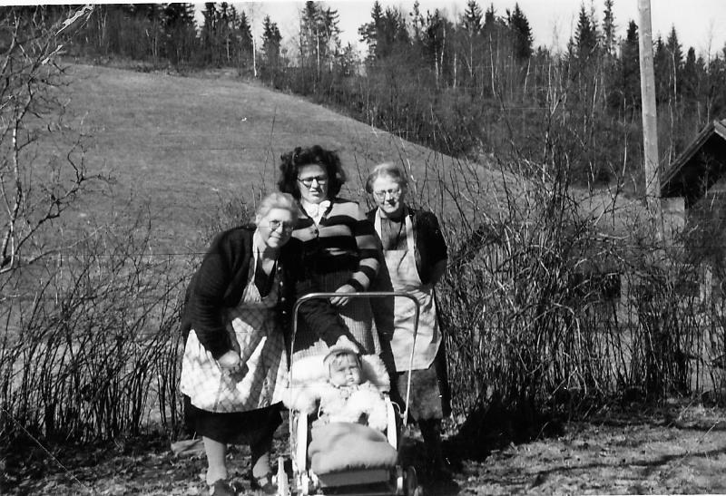 Bildet tatt på Jordet på andre siden av veien ved Prøis. (Nær Løvåsjordet) I midten Kari Rustand født Prøis og til venstre Martha Haugen (Kari's mor) og tante Ingeborg Haugen til høyre. I vognen et av Karis 3 barn. Kari var gift med Olaf Rustand som har gjort en betydelig innsats for Historielaget som styremedlem, sekretær/redaktør. Antatt tidspunkt : tidlig på 1950-tallet.