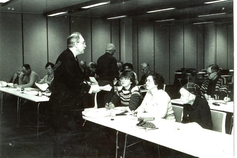 Bildet viser en kurskveld i Gotisk Gruppe som i Historielagets regi ble startet i 1983. PÅ bildet ser vi kursleder Fylkeskonservator Geir Helgen.
