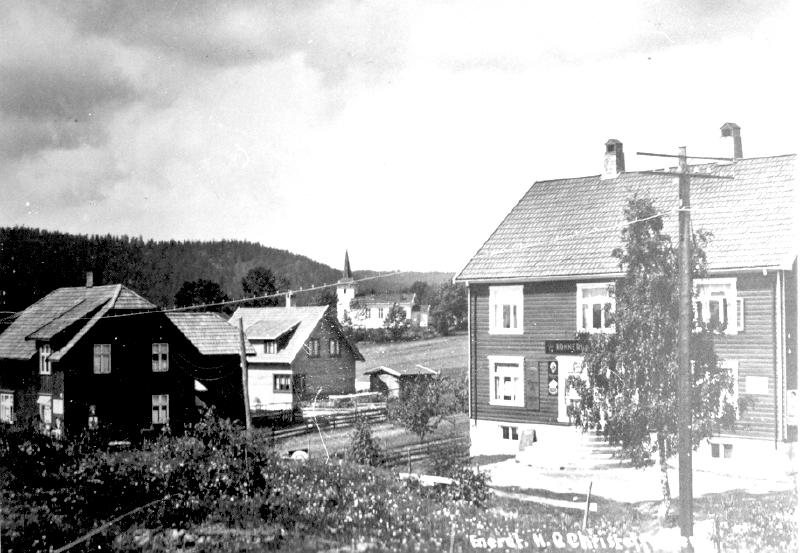 Konnerud KIrke i bakgrunnen. Bildet er tatt fra Postsvingen. Konnerud Landhandel ble bygget ca 1920 av Nils Skjelsbæk, som var den første som drev landhandelen. Senere var det flere eiere, og ii 1936 kjøpte Karl Langerød landhandelen. Da var 4-5 ansatte. Det var et meget stort utvalg av varer i butikken. Se forøvrig Kristian Langeruds artikkel i Historielagsnytt nr.