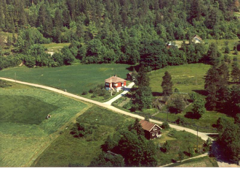 Solstad i Aaserudkroken. Her bodde Ingrid og Rudolf Martinsen. Solhøy hvor Arne Kaspersen med familie bodde, ligger ovenfor. Redskapshuset og revefarmen til Vestre Aaserud ligger nederst i bildet Tekst: Torill Juel