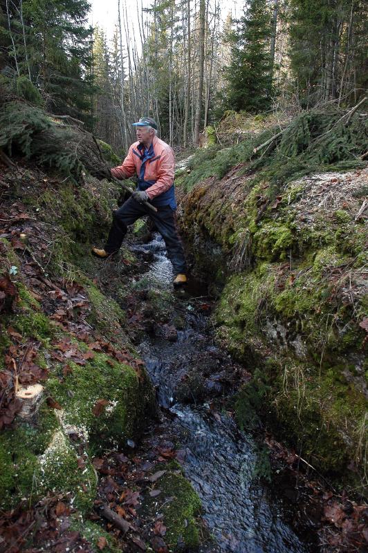 Eier av gården Grinderud, Erik Grinderud. Her ser en Erik Grinderud ved Jon Tolgens Mølledam. I vassdraget mellom Langmyrdammen og Stordammen (galme Grinderud gård) lå det 4 møller etter hverandre og rester av den øverste demning er fortsatt godt synlig.