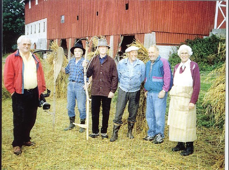 Bruk av gammel redskap tas opp på video. Erling Pedersen som videofotograf, fra v.: Gunnar Karspersen, Arne Larsen, Helge Furuvold , Gunnar Engen og Astrid Engen