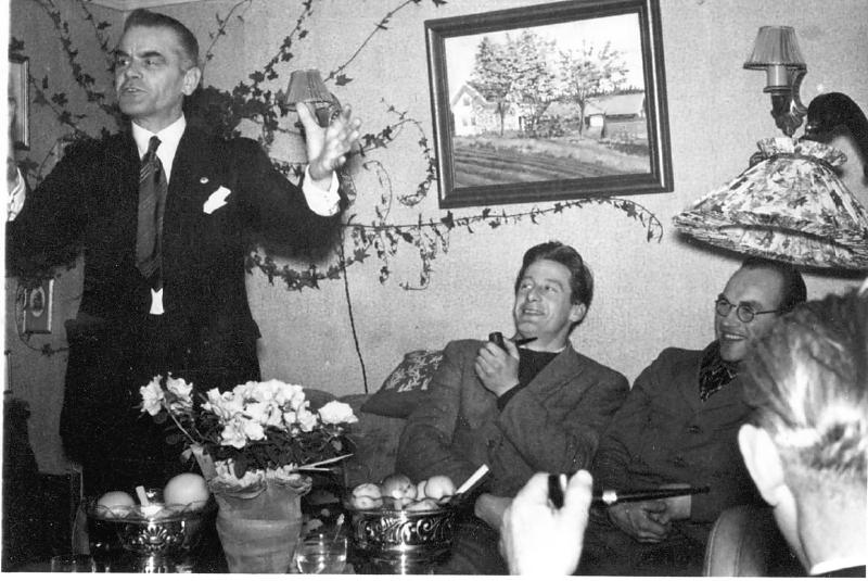 Oscar Stubberud f. 1903 har 50 års dag hjemmme på stubberud og gode arbeidskolegar feirer dagen. fra v. Paul Nøstedahl, Leif Backmann, Ingvar Kaugerud