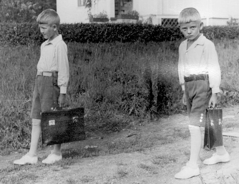 Første skoledag for Sverre (tv.) og Oddvar Haveraaen. Sverre f. 16.01.1930 og Oddvar f. 20.02.1931. De er sønner av Emma og Harald Haveraaen. De fulgte hverandre på skolen til og med gymnaset. Sverre gikk så på Norges Tekniske Høyskole (NTH) i Trondheim elektro sterkstrøm. Han arbeidet som forsker ved Christian Michelsens Institutt i Bergen. Oddvar gikk på skogskolen på Kongsberg før han tok skogbrukslinjen ved Norges Landbrukshøyskole på Ås.. Han underviste han senere og på høyskolen og avsluttet som professor. Han forsket på diverser områder innhøyen skogbruk. Fra 1970 til m1973 var han i Uganda der han var med å starte opp eget faklultet i skogbruk ved universitetet i Kampala. Se ellers bilde nr. 1899.