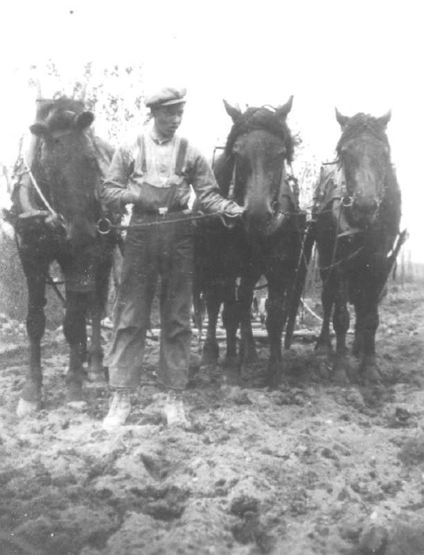 Helge Springover Johansen ( bror til Harald ) som dreng på Skjeldrum. Her harver han med 3 hester