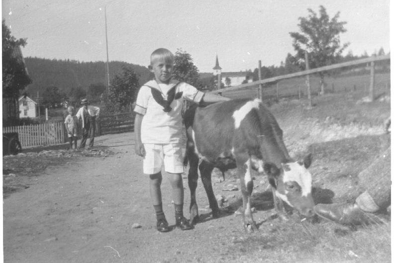 Kjell Thue som liten gutt en sommerdag i Postsvingen ved Ekholt. Konnerud kirke sees i bakgrunnen