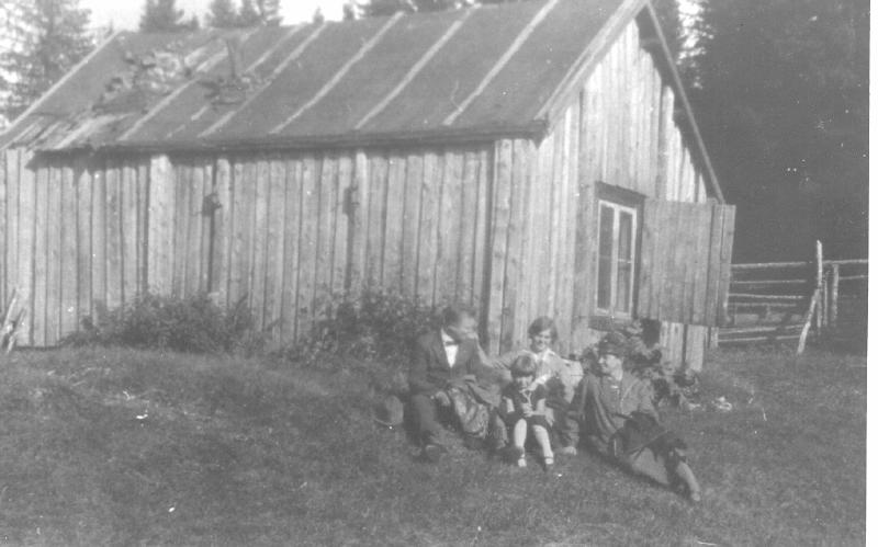 Riseplassen brant i 1944. De som sitter er : Henry og Margit Stubberud. Margit Stubberuds mor + et barn ved navn Mary, reiste senere til Amerika