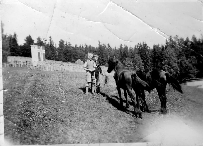 Ove Regstad og Reidar Mortensen. De står foran revegården. "Tårnet" i bakgrunnen ble brukt som utsiktstårn for å kontrollere revene i paringstiden. Dette tårnet var malt i det Norske flagget over hele veggen. Tårnet ble revet en gang under krigen 1940 - 1945.