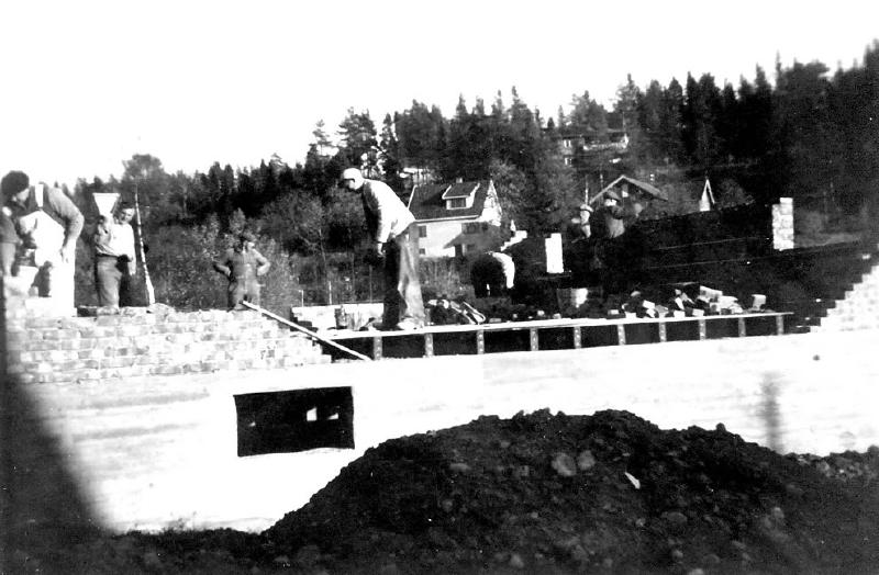 Denne sommeren var det vannmangel. Vann til støping ble kjørt med hest fra Halden , På dette bilde sees.: frav. Martinius Larsen, Harald larsen, Erling Bråthen . Arne Bjerkeseth. Denne gjengen var med å mure Oslo Rådhus.