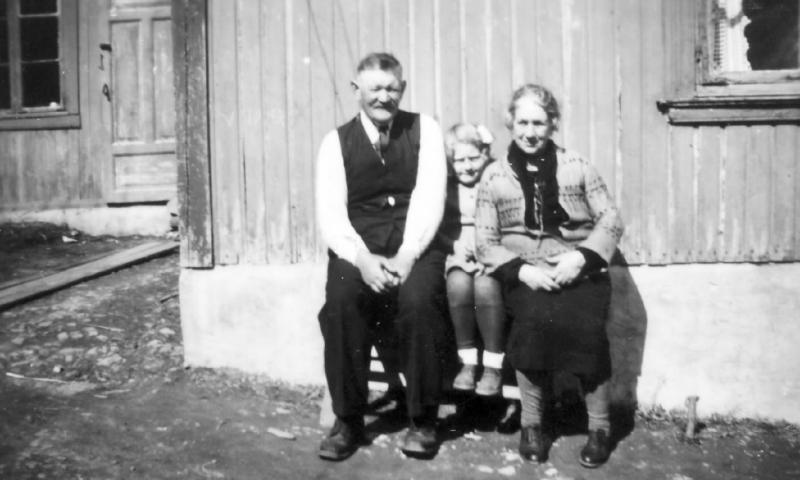 Bildet er tatt i Kobbervikdalen, som barn sa vi " Dælane". Det er mine besteforeldre Bertha Johansen og Karl Johansen som sitter her. Klemt innmellom sitter min kusine Ingjerd Brunes ( Johansen) Karl f. d.1948 Bertha f. 1874 d,1957 Ingjerd f, 25.09.1939