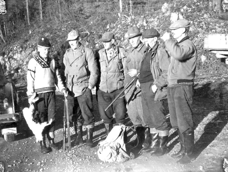 Fra v.: Gunnar Olsen, som stolt holder "byttet". Arne Andreassen, Erling Olsen, (Gunnars far), Trond Haug, Emil Johansen, ( min far). Ole Johansen. Dette var dyktige jegrer. Emil Johansen f. 26.08.1899 - d. 1984