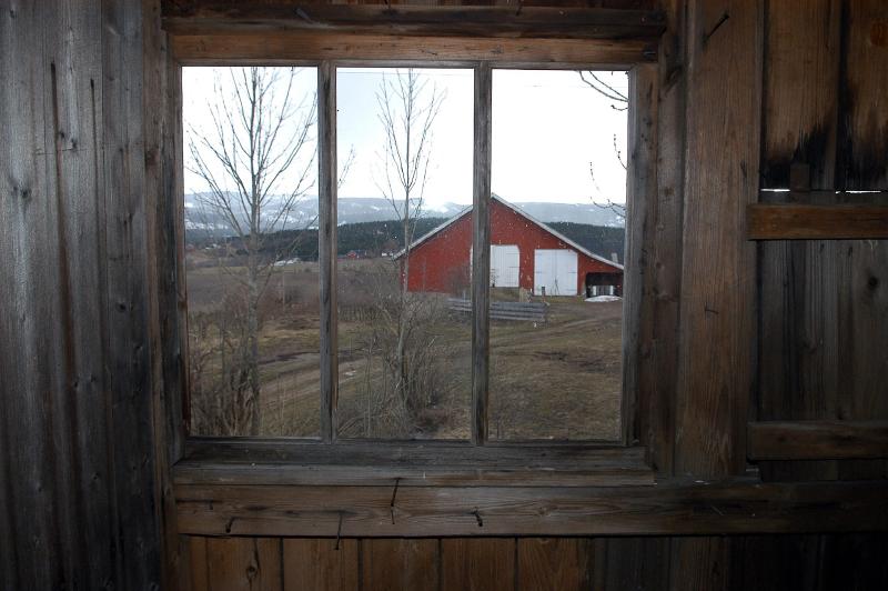 Utsikt gjennon et vindu på saga tidlig om våren før vi startet restaureringen.