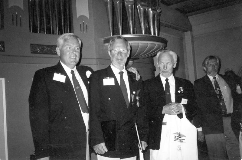 Fra venstre: Arne Karoliussen, Einar Borgan, Arild Ødegaard. Korets dirigent i bakgrunnen, Knut Strøm Andersen. Tatt i forbindelse med landssangerstevne på Hamar.
