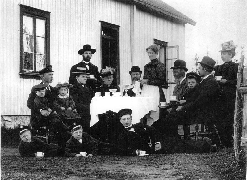 Bildet er tatt ved hovedhuset på Treholt, Stubberud på konfirmasjonsdagen til Johannes Lie en dag i august. I rekke liggende foran fra v.: Daniel Lie, Kristian Lie, Johannes Lie. Sittende på venstre side: Kjetil Lie ( f. Kvernhaug, Svene i Nummedal) med Kondrad og Lydie på fanget. Gruppe to fra v.: Emiser Lauritz Haugen, sittende foran på venstre side, hans kone Pauline, f. Nedberg. på h.side Dorthea Haugen, gift med Kristian Haugen. Kristian Haugen sitter midt på bildet. Stående til høyre for Kristian: Gunda Lie, f.Haugen, Johan Krinkhaug - far til Kjetil - som i 1862 kjøpte Jonseplassen og ryddet den. Han var gruvearbeider og var spesialist på å hugge stemplingskubb. August Svedsen med Carl Svendsen på fanget. Stående bak: Julie Svendsen, f. Haugen, søster til Lauritz og Gunda